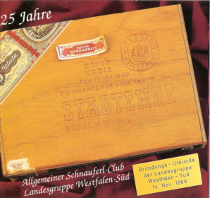 Neben Liebe aller Schnauferlbrüder zum historischen Automobil, zu den ¨alten Kisten¨, verbinden wir Siegener ASC’ler mit unserer ¨Kiste¨ noch etwas ganz anderes: unsre ¨alte Zigarrenkiste¨ mit der Aufschrift, ¨Stadtehre – die Zigarre für hohe Ansprüche¨, die Gründungsurkunde unserer ASC-Bezirksgruppe Siegen und der späteren Landesgruppe Westfalen-Süd.